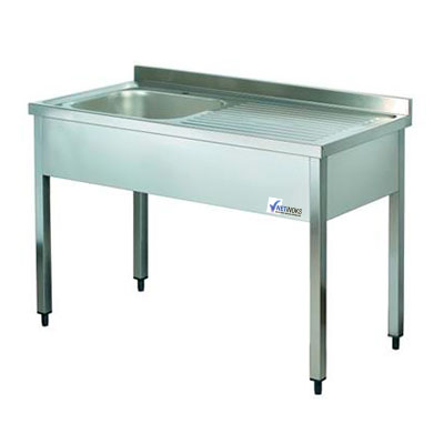 Çeşitli ölçülerde imalatı yapılan evyeli çalışma tezgahlarının ata raflı, alt tablalı, dolaplı, çekmeceli ve polietilen tablalı çeşitleri mevcuttur.. Ergonomik kullanım için dizayn edilmiştir AISI 304 18/8 Cr-Ni kalite paslanmaz çelik kullanılarak imal edilir Üst tabla 1.5 mm kalınlığında paslanmaz çelikten imal edilmiştir Dört adet çekmece mevcuttur ve çekmece sistemi çarpmaya karşı korumalıdır Ayarlanabilir ayaklar kullanılmıştır.